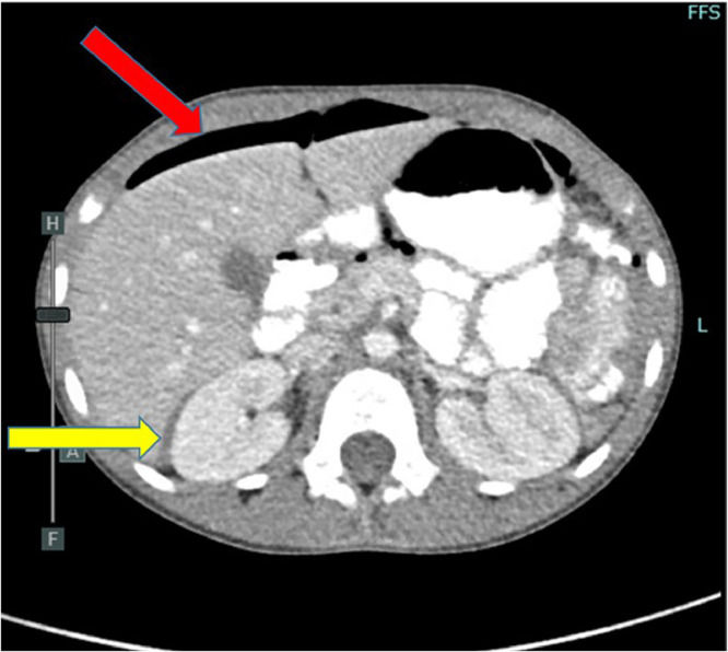 Axial view – CT abdomen/pelvis with IV and PO contrast demonstrating small-volume pneumoperitoneum (red arrow) and complex free fluid in the hepatorenal space (yellow arrow).
